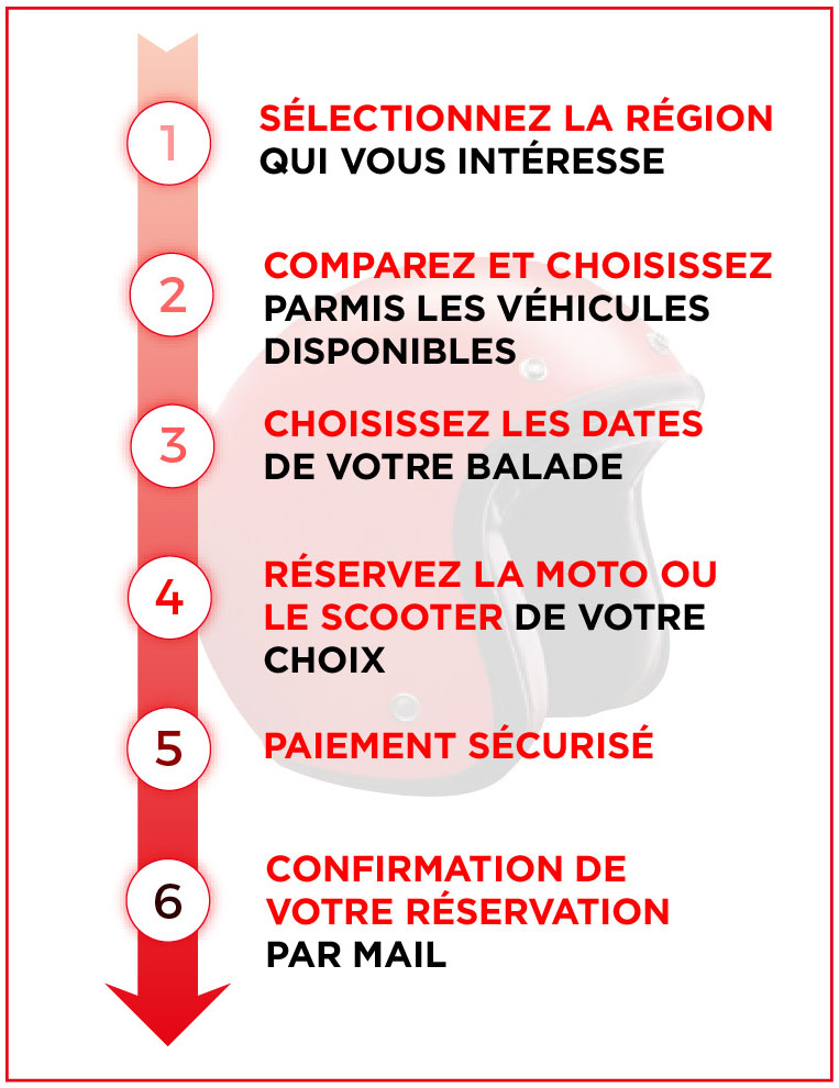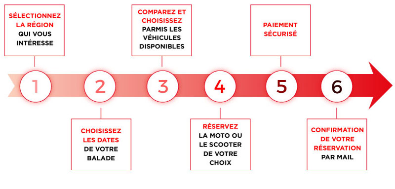 Ainsi, vous accéderez directement au catalogue motos et scooters de l’agence que vous avez choisie. Vous retrouverez aussi toutes les informations essentielles sur nos véhicules (visuel du véhicule et sa description, caractéristiques, kilométrage autorisé…).